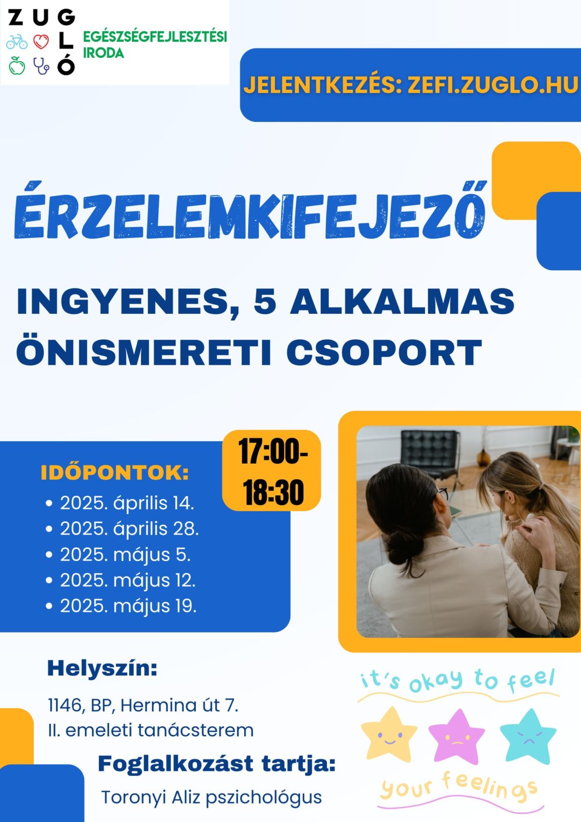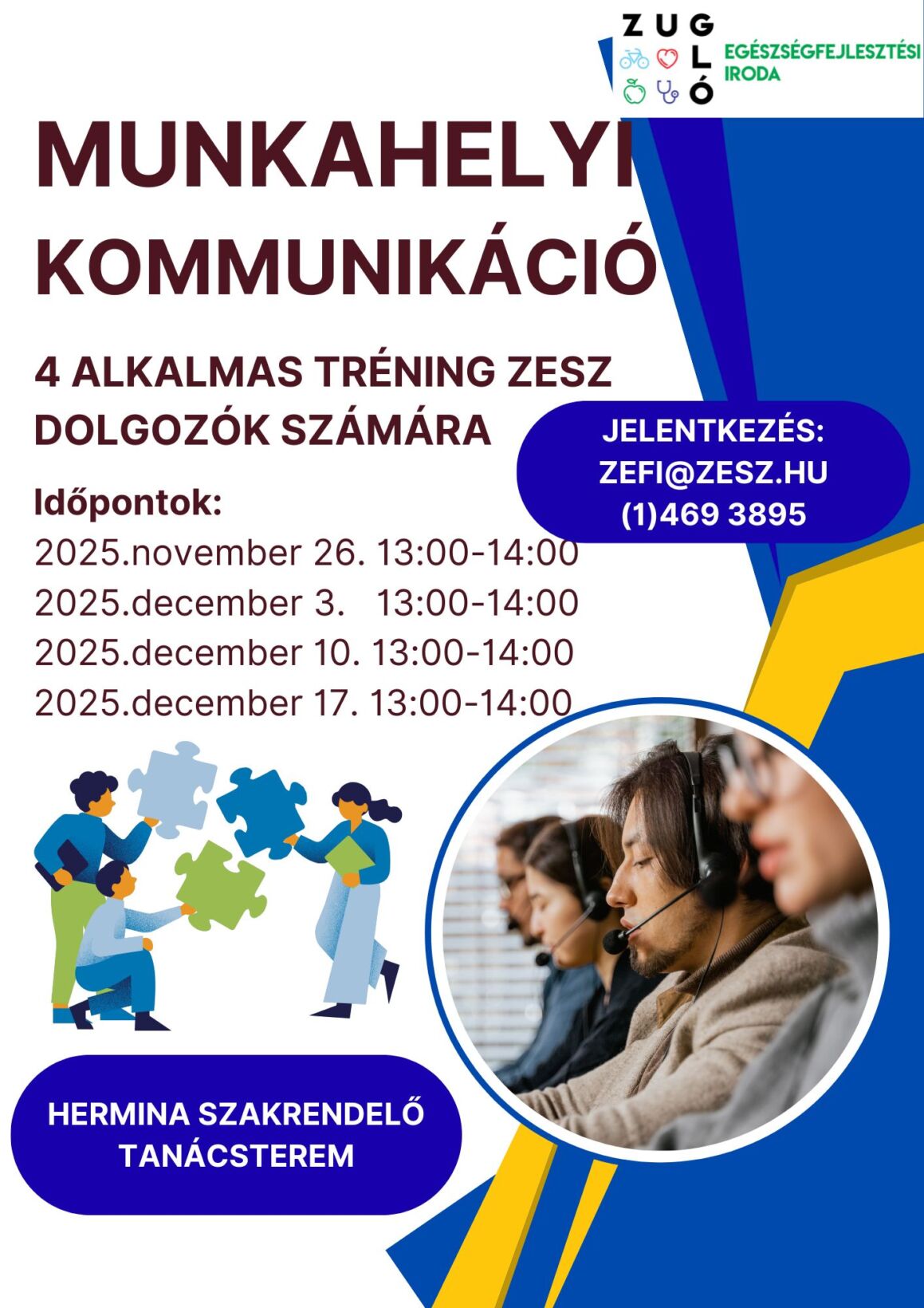 Fizioterápiás világnap 2026.02.18. Fizioterápiás világnap Tovább olvasom “Fizioterápiás világnap”… Fitten a munkahelyen előadások 2025-2026 2026.02.18. Fitten a munkahelyen előadások 2025-2026 Tovább olvasom “Fitten a munkahelyen előadások 2025-2026”… Érzelemkifejező tréning 2025 2026.02.18. Érzelemkifejező tréning 2025 Tovább olvasom “Érzelemkifejező tréning 2025”… Dolgozói torna 2025 2026.02.18. Dolgozói torna 2025 Tovább olvasom “Dolgozói torna 2025”… Asszertív kommunikációs-és stresszkezelő tréning 2026.02.18. Munkahelyi egészségfejlesztő tréning Tovább olvasom “Asszertív kommunikációs-és stresszkezelő tréning”… « Előző 1 2 Skip back to main navigation